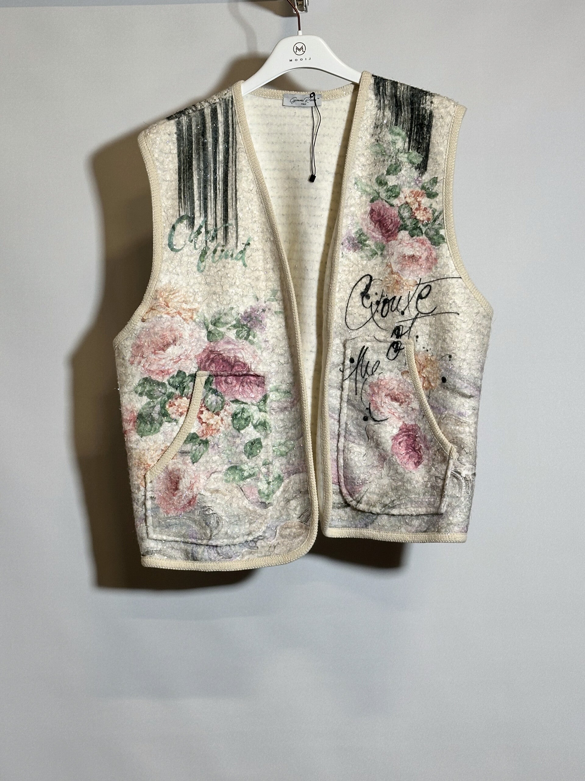 open colbert, met roze bloemen print. neutrale zachte kleuren.