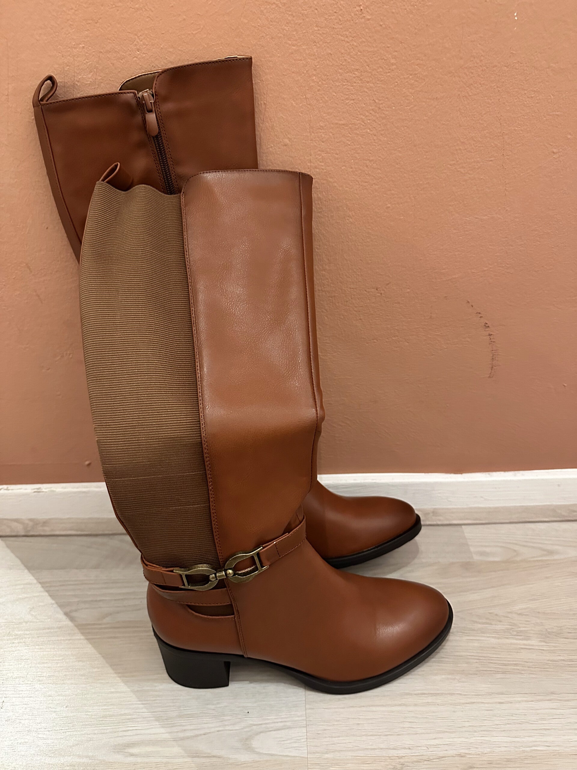 leuke bruine dames laarzen, met elastische stukken fijn voor brede kuiten. maat 40.